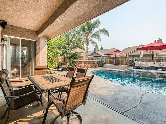 This beautiful one owner Leo Wilson home has Three Bedrooms, an Office or potential Fourth Bedroom, Three Bathrooms & sits on an 8,400+sf lot in the highly desirable Clovis Unified School District. Be prepared to relax & have fun in the backyard oasis that features a sparkling Pebble Tec Pool w/Water Feature, Outdoor Kitchen, covered Patio, and a landing perfect for lounging next to the water. Upon entering you will notice the soaring ceiling in the Foyer & a Formal Dining Room with beautiful French Doors. The Chefs Kitchen features newer stainless steel appliances, farm sink w/reverse osmosis water, tons of cabinet space, Breakfast Bar & Nook. The isolated, spacious Master Suite has private access to the backyard, two walk-in closets & an Ensuite Bathroom featuring a relaxing soaking Tub, Shower, separate vanities & linen cabinet. Other extras include a whole house water filtration system, three-car garage, leased solar, tile roof & it's conveniently located by the neighborhood park.