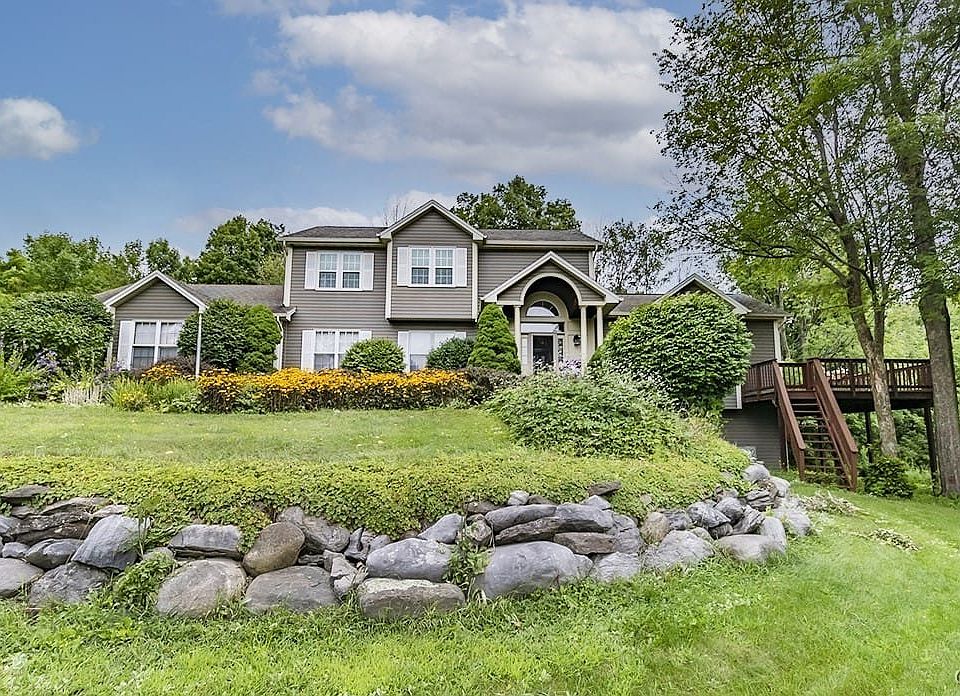 If you're looking for a custom built colonial home on just shy of 5 acres with a private setting, mature trees, beautifully landscaped, with a fantastic view, in a sought after area, look no more! The moment you drive up the flower and tree lined driveway you'll begin feeling excited. Then as you exit your vehicle and walked down the brick walkway, lined with shrubs and flowers, looking across the valley you'll will be awestruck. As you enter the home you will love the vaulted ceilings, hardwood floors, spacious layout, and ample windows allowing for natural light. From the eat in kitchen with custom maple cabinets, and large island, you have direct access through a slider to your wrap around deck offering a 20 mile view of the valley to Song Mountain Ski Resort and beyond. The first floor also offers a formal dining room, office, and laundry room. Upstairs you will find four bedrooms with plenty of closet space and two full baths. The primary bedroom has a walk in closet and a full size bathroom with jacuzzi tub. The large finished lower level has additional storage areas, a full bathroom, family room, and a walk-out slider to a brick patio. This rare gem won't last long! 2024-10-01