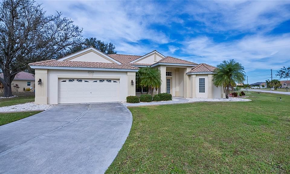 MAJOR 115k PRICE IMPROVEMENT, BRING OFFERS! Creating a lasting first impression, is this immaculate 3/2/2 residence on an OVERSIZED PIE SHAPED LOT with rich barrel tile roof nestled in the sought after community of Deep Creek with SUPERIOR CRAFTMANSHIP at every turn including lush landscaping , concrete curbing, banded column accents and soaring entryway. This magnificent, split floor plan home is spacious with real oak floors , recessed ceilings, tasteful plant shelves and NO CARPET anywhere, leading you through a thoughtfully designed floor plan with refined ambiance throughout.The kitchen features stunning CORIAN countertops, rich cabinetry, stainless appliances, and a stylish breakfast bar made for perfect for entertaining. The master bedroom's a spacious and tranquil retreat, offering an ensuite bath with a lavish ROMAN SHOWER plus custom CALIFORNIA CLOSETS, further elevating the sense of luxury and convenience. Both guest suites provide equally sumptuous accommodations, ensuring that every corner of this residence exudes an unparalleled level of comfort and style. Both a large family room plus living room and separate dining room, inside laundry room and NEW A/C. The back patio is screened and lives large, so plan on mornings and evenings just enjoying the tranquility with this Florida dream or plenty of room here to have nice social gatherings or add a pool.This property epitomizes ease and comfort, situated in a low yearly HOA community and NOT in a flood zone. Located in Southwest Florida, this property offers year-round access to boating, fishing, golfing, various Gulf beaches, natural resources, dining establishments, parks, public tennis courts, and shopping. Culturally enriching events are held regularly, with multiple baseball parks in close proximity. Conveniently situated just 8 minutes from the Tampa Bay Rays Training Stadium, 1.9 miles from a shopping mall and numerous parks, and a short 35-minute drive from multiple Gulf beaches, this residence provides exceptional accessibility. The Punta Gorda Regional Airport, served by Allegiant Air, is located a mere 12.3 miles away.Notably, Fisherman's Village and the Historic District, with their diverse array of dining and shopping options, are approximately 9.3 miles away. This residence truly merits a personal viewing to fully appreciate its remarkable offerings. Schedule your showing to see this beautiful home today on an extra roomy lot!