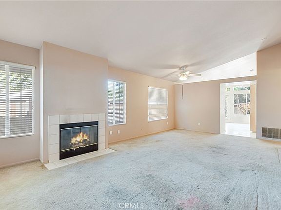Discover this charming 1318 square foot single story home, nestled on a 4356 square foot lot in the 55+ Springhaven community of Menifee. Featuring 3 bedrooms, 2 bathrooms, and a 2-car garage, this property offers both comfort and convenience, with potential for stunning curb appeal. Enjoy the added benefit of being adjacent to a large park, complete with plush green grass, walking paths, gazebos and sitting areas perfect for outdoor activities. Upon entry, you will be welcomed by an open floor plan featuring a mix of tile and carpet flooring, a calming color palette, and abundant natural light. The inviting living space is enhanced by a cozy tiled wood-burning fireplace. To the right of the entry is a convenient laundry room, while the living room boasts high ceilings and a ceiling fan for added comfort. The living room seamlessly flows into the kitchen, creating a perfect layout for relaxation and entertaining. The kitchen offers tile countertops, a 4-burner stove with an oven, white appliances, and plenty of cabinet and counter space. A door provides easy access to the backyard, while a window fills the space with natural light, adding a bright and airy feel. Moving down the hallway, you will discover the bathrooms and bedrooms. The hallway bathroom includes a shower/tub combo, single sink vanity, and laminate flooring. The spacious master bedroom boasts high ceilings, carpet flooring, a walk in closet, and a sliding glass door that opens directly to the backyard, creating a seamless indoor-outdoor flow. The attached master bathroom offering a single sink vanity, carpet flooring and a walk in shower. The two additional bedrooms offer plenty of space and comfort, each with different features. One bedroom includes carpet flooring and two large storage bookcases, while the other has laminate flooring. Both rooms are equipped with windows for natural light and closets with sliding doors for ample storage. Outside, the backyard presents a blank canvas for your personal touches and can be customized to suit your preferences. The open back patio provides a perfect setting for entertaining guests. The home's location is convenient, with shopping centers, freeways, and highways nearby, offering a perfect blend of comfort and accessibility.