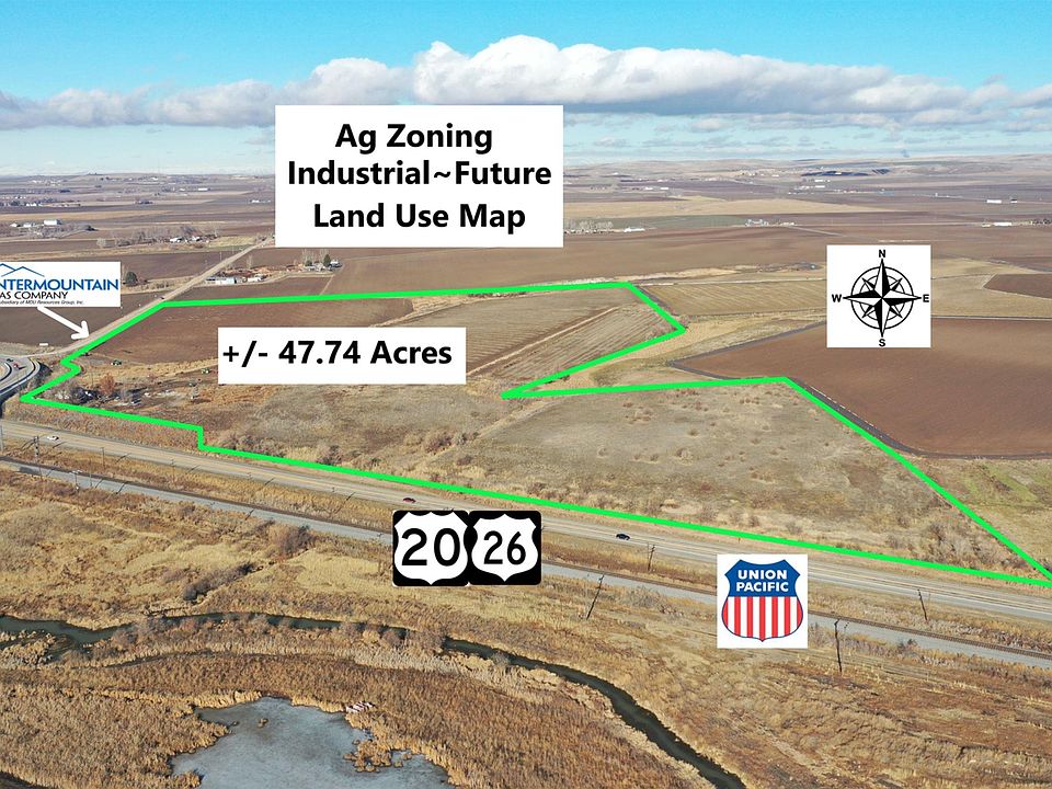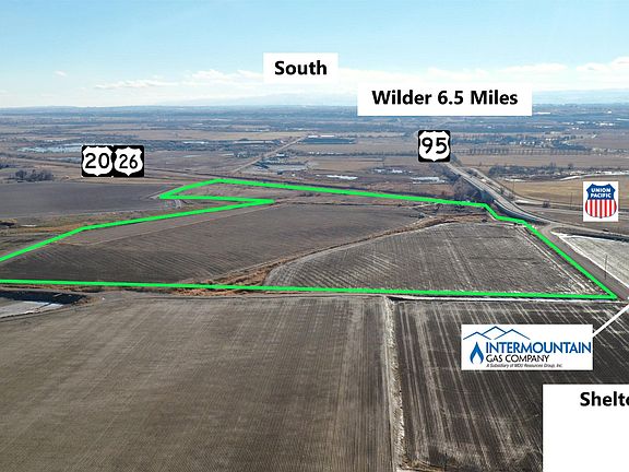 Excellent opportunity to purchase Farm ground with Industrial potential. Approximately 1100 feet of State highway frontage. At the convergence of US 95 and US 20-26. Adjacent to a Natural Gas line. Close proximity to Rail, and has a residence included, plus 1 more residential permit available. Secondary residences are also allowed for a total of 4 potential homes. Full water shares available for Irrigation. Currently zoned Ag and showing Industrial on the newly adopted 2030 Future Land Use Map. Domestic Well log shows 40 GPM. BTVAI.