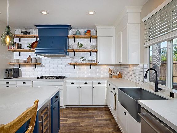 Situated on a beautiful tree-lined cul-de-sac street, this impeccably maintained Bressi Ranch home offers easy access to neighborhood parks, Poinsettia Elementary, and Pacific Ridge School. Create lasting memories in your newly renovated kitchen, where sleek quartz countertops and a spacious island invite lively gatherings. A mini wine fridge adds a touch of sophistication, while new appliances ensure every meal is a joy to prepare. The great-room, redesigned for an open-concept living space, features a refaced fireplace, perfect for cherished family moments. Newer LVP floors seamlessly flow throughout the downstairs, creating an inviting and cohesive living space. Let your inspiration and productivity flourish in the private office with elegant glass French doors. Experience the ultimate retreat in your peaceful and private backyard, complete with a cozy fire pit and tranquil water feature, providing the perfect space for rest and relaxation. Additional upgrades include new carpet, newer: water heater, exterior paint, air conditioner, garage door opener, shutters & blinds, vanishing screens, and ceiling fans. Bressi Ranch offers a walkable lifestyle with easy access to Bressi Village for dining and shopping, the community pool & spa, and eight neighborhood parks. Located just a short drive from Carlsbad's pristine beaches, Legoland, La Costa Resort, and the Four Seasons at Aviara, this home embodies both comfort and convenience.