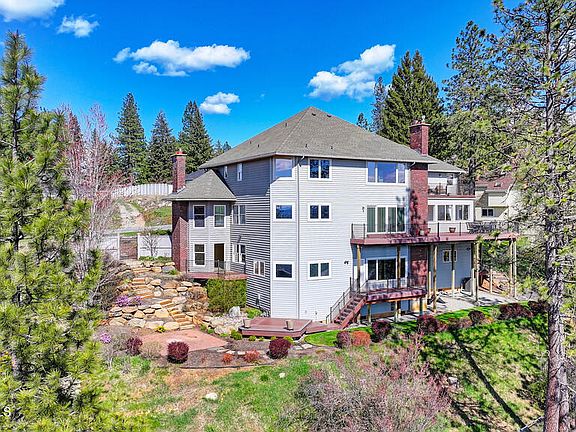 Hillside Oasis with Unmatched Views of majestic mountains, the vibrant cityscape, and the shimmering waters of distant Lake Coeur d'Alene. This exquisite 6,000+ square foot haven is not just a residence—it's a lifestyle, a retreat, and a sanctuary that redefines luxury living. Discover multiple elegant living spaces designed for both entertaining and relaxation. The formal dining area sets the stage for unforgettable gatherings, while five stunning fireplaces create a warm ambiance throughout the home. Imagine cozy evenings gazing out at nature's magnificent backdrop. Need to recharge? Enjoy the private primary suite, a retreat that features a spacious living area, a secluded deck perfect for morning coffee, and a sumptuous spa-like bathroom that invites you to unwind. A personal gym and sauna await, complemented by expansive closet space. Multiple exterior decks provide ample outdoor living space. Gather around the fire pit under a starlit sky.