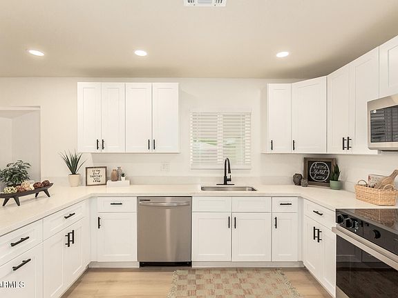 This gorgeous remodeled home in Dobson Ranch with community pools, playgrounds and MANY lakes for fishing and walking. Nestled in a peaceful cul-de-sac, this gem has it all—3 bedrooms, 2 bathrooms,2-car garage & RV gate.Inside, you'll find 2 spacious living areas featuring laminate flooring, vaulted ceilings that add an airy feeling, a brick fireplace in the family room for cozy evenings, and a neutral palette. The pristine kitchen shows white shaker cabinetry, quartz countertops, breakfast bar, and stainless steel appliances. Primary suite with walk-in closet & ensuite bath with custom tiled shower.The backyard is complete with a huge covered patio and plenty of space for outdoor fun. Bring your ideas to life and create your backyard oasis!Close to shopping, freeways and more!
