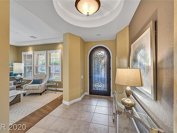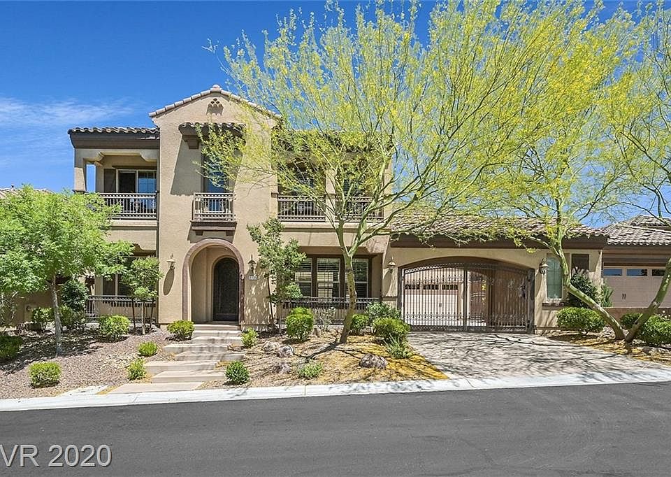 Highly sought-after Valencia floor plan with wrought iron automatic gates. 6 beds + loft/game room. Kitchen fit for a chef stainless steel GE Monogram appliances, 2 built-in convection ovens, built-in refrigerator, wine refrigerator, granite counters island breakfast bar and breakfast nook. Family room is open to the kitchen fireplace and media niche. Spacious formal living room. Formal dining room with cathedral ceiling. Loft/game room has a front balcony. Master retreat is separate from other bedrooms and has a sitting area, media niche, his and hers walk-in closets, sep tub and shower. Generously sized bedrooms and a casita all with bathrooms. Throughout, you will find upgraded touches like plantation shutters, crown molding, laundry room with sink and cabinets, upgraded lighting package. The backyard paradise has everything you need, including self-cleaning pool and spa, built-in BBQ, 2 covered patios and lush low maintenance landscaping. Near new Raiders training facility.