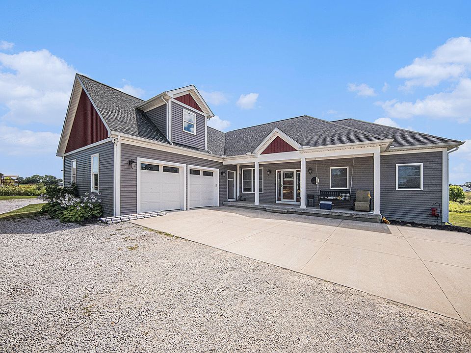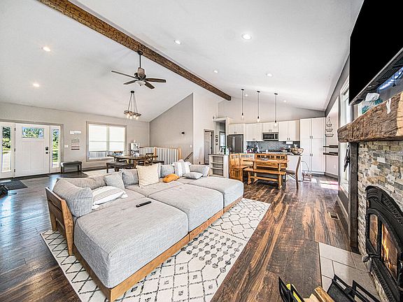 Offers due 8/23 10AM. Practically New!! Custom Built Contemporary Ranch with Walkout Basement and Studio Apt. Open Entry with soaring ceilings leading to great room, dining and kitchen. Primary Bedroom at one wing of the house with ensuite bath and walk in closet. Two other bedrooms with bath off kitchen. Custom kitchen open to great room with fireplace and floor to ceiling bookcases. Downstairs to lower level walkout has a family room and two bedrooms and bath. Walk up the garage stairs to a studio apartment over to the three-car garage. Walk across a bridge over the creek running through the property to a quaint ''she shed.'' Another outbuilding along the property for extra storage. Solar panels enhance lower electric bills.Agents are related to Seller.