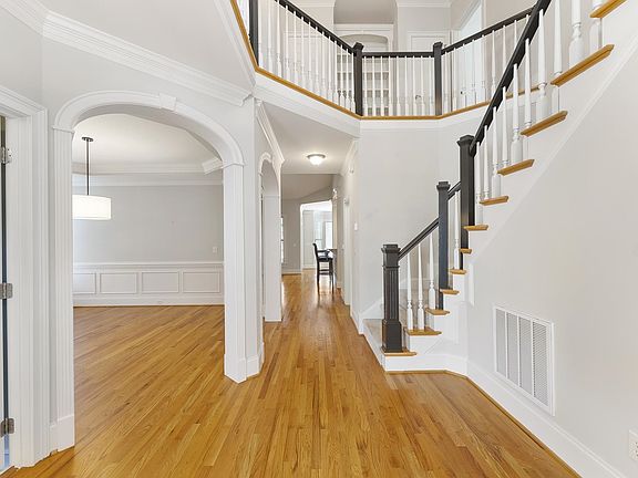 Gorgeous 4 bedroom home in Bedford's Riverwalk neighborhood. Gleaming hardwood floors greet you as you enter the grand two story foyer. First floor owner's suite with spa like bath and a first floor guest suite with an updated full bath - this room could be used as an office. Formal dining room with beautiful molding, family room with gas log FP, kitchen features SS appliances, gas range, and pantry. The bright and open sunroom over looks the beautifully manicured & fenced backyard with paver patio. Two bedrooms, a huge bonus room, and another full bath are upstairs. The exterior has been freshly painted! Access to the Neuse River trail is just through the fence gate. Conveniently located to I540, Shoppes at Bedford, medical facilities, and so much more!