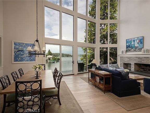 Arrive with ease via the level driveway and exterior elevator, providing direct access to all three levels of the home. Renovated down to the studs in 2015 by renowned contractor Ron Dolman, this property blends modern elegance and sophistication. The prow-front wall of glass captures stunning lake views, soaring ceilings, and striking wood beams accentuate the open floor plan. The kitchen features top-quality natural slab countertops, high-end fixtures, and appliances throughout.