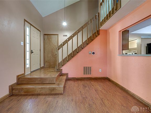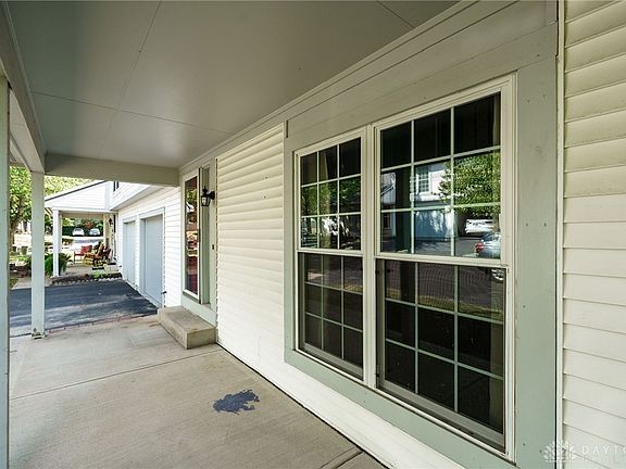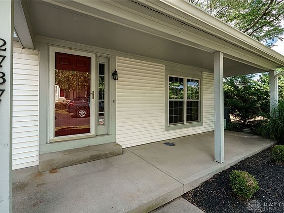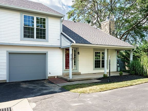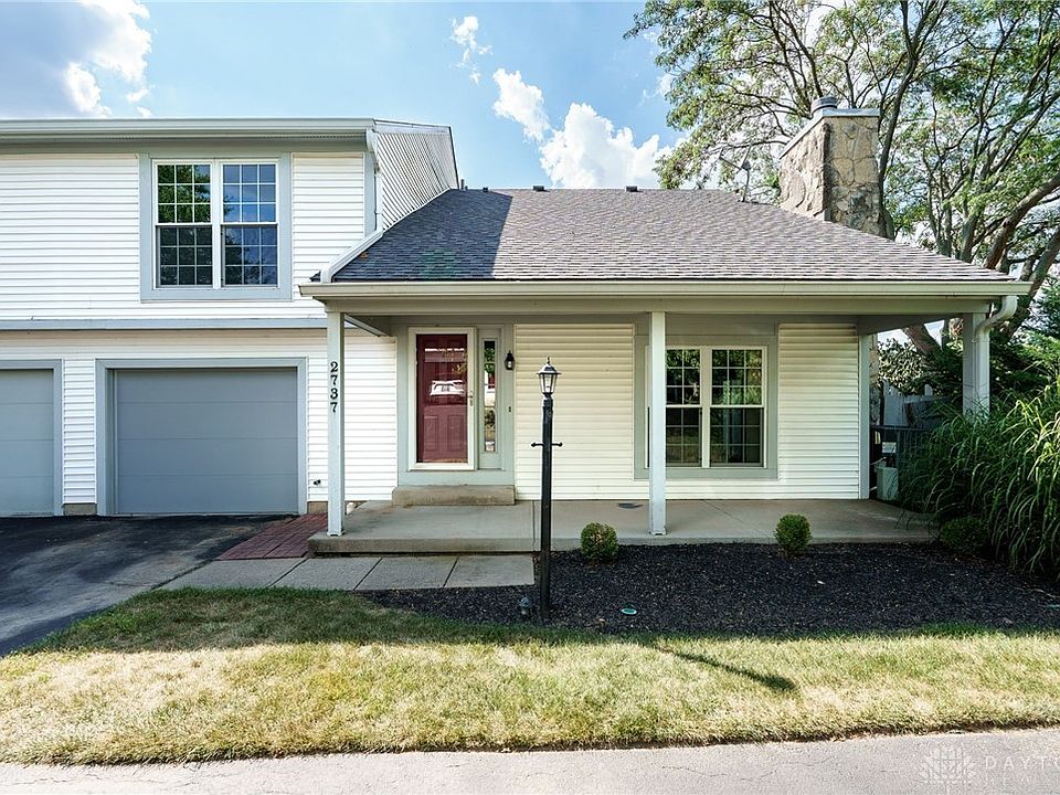 Cozy and maintenance-free condo is available and ready for it's new owner! Unit is tucked back from the road and private with mature trees and beautiful common space area nearby. Large front porch is perfect for relaxation and gives a welcoming entry. Main level offers open floor plan with living room, dining room, kitchen, laundry and half bathroom. Scraped, laminate flooring throughout! Amazing high vaulted ceiling and stone fireplace add unique and interesting detail. Upstairs the loft area allows for a 2nd bedroom or open area with railing. Primary bedroom is large with tons of natural light and walk-in closet. Full bathroom upstairs has a fun glass bowl sink, tile shower with tub and glass doors. Desired attached garage is a huge bonus and fenced-in patio gives even more space for hanging out. Ideal location - many amenities and conveniences located close by including the Dayton Mall, endless restaurant, shopping and entertainment options!