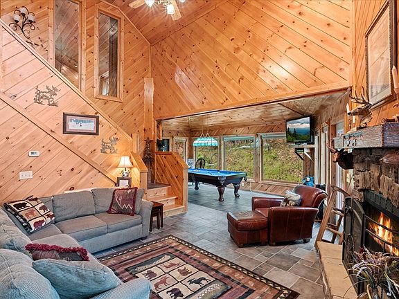 Beautiful, meticulously maintained cabin in Shagbark perfect to be used as an overnight rental, second home or permanent residence! You will be impressed with the floor to ceiling, two story glass gable wall right from the moment you walk inside. You will notice that this property has been cared for and routine maintenance and cleaning has not been neglected. The lot is level with plenty of level parking--you are able to walk all the way around the home! There are 3 Bedrooms with 3 en-suite full bathrooms. There is a large open sun room that is being currently used a pool table room on the main level. Upstairs hosts the master bedroom and a loft that could be utilized as an additional sleeping area. Photos taken 5/23/22