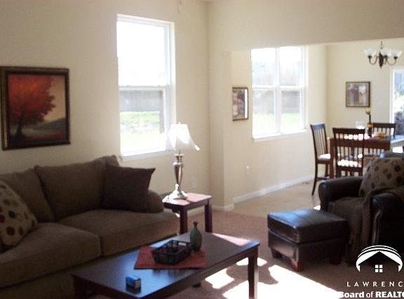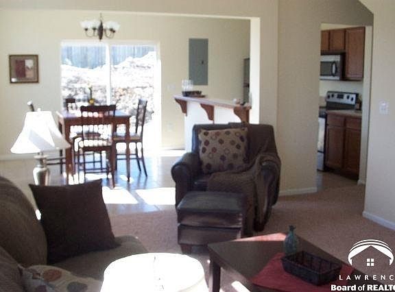 Excellent value, super location in country like location. With 4th non-conforming bedroom. Master on main level. 3 baths. Light bright vaulted floor plan. Snow removal, lawn care included for easy living. 2 car garage! Easy K-10 commute to KC and Lawrence. Rural Dev. financing possible.