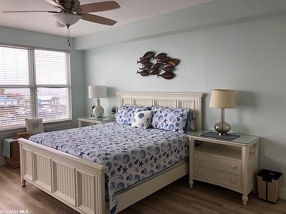 Beautifully decorated 2 bedroom / 2 bathroom in Navy Cove Harbor that offers incredible sunset views of Mobile Bay! Unit is in great condition as it has not previously been in a rental program. The unit offers luxury wood vinyl through out, granite counter tops, updated cabinets, 1 year old a/c (both inside and out), double vanities in the bathrooms, separate jacuzzi tub and shower in the master bedroom suite, views of the Bay, swimming pool and hot tub. The complex offers outdoor pool, hot tub, fitness area, deeded boat slips (#16), including a boat lift to convey, boat ramp, boat/trailer storage, gated entry, grilling area with a gazebo and much more! The unit also is walking distance to the beach! What more could anyone want? This unit is perfect for that second home or investment/rental buyer.