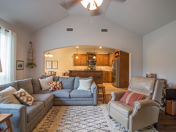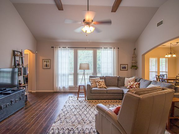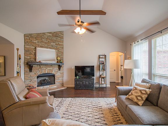Beautiful wood floors, new paint, SS appliances, corner stacked stone fireplace. Open living w/ eating area. Granite kitchen, office, split bedroom floor plan, oversized garage. New privacy fence, extended patio. Backs to greenbelt. Neighborhood pool/park