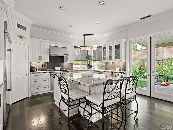 Discover your dream home in Pacific Hills, tucked away on a serene L-shaped street ending in a quiet cul-de-sac. This beautifully upgraded property combines luxury with thoughtful details that enhance both style and function. Enter through a custom stone pathway, and be welcomed by a bright, open interior with wood flooring throughout the main level. The dining room showcases lighted wine racks, and a stunning two-sided fireplace seamlessly connects the living spaces, complemented by a custom entertainment center and integrated surround sound. The chef’s kitchen features top-of-the-line appliances, including a 36” Thermador gas range, a 48” Kitchenaid refrigerator, and an elegant Venetian plaster backsplash. Step through French doors into a private backyard oasis designed for relaxation and entertainment, complete with a three-hole putting green, a lighted, covered custom stone patio with a built-in gas modern fire table, tropical landscaping, plus avocado and lime trees. This home’s additional upgrades include smart tech throughout, such as a Ring alarm system, app-controlled thermostat, and remote garage and front door access, plus practical touches like lighted vanity mirrors, a whole-house fan, and garage storage. Of course the home also enjoys all the benefits of membership at the beautiful Lake Mission Viejo. Experience refined comfort, functionality, and tranquility in this meticulously crafted Pacific Heights gem.