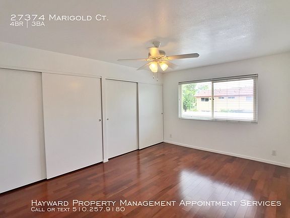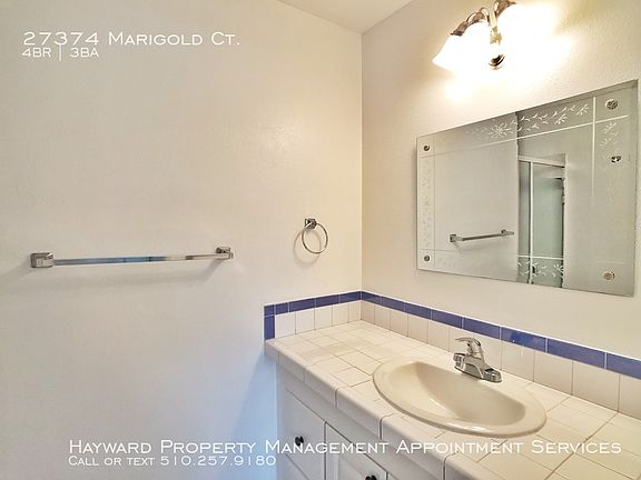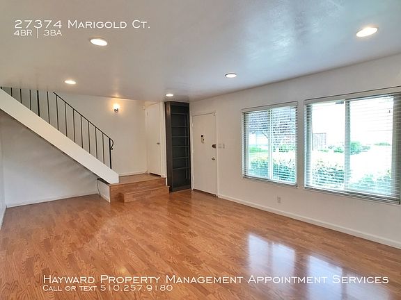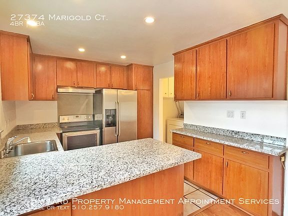 SCHEDULE A SHOWING ONLINE AT: showmojo.com/lh/01eecca07e 27374 Marigold Ct. Hayward, CA 94545 4BD/2.5BA - Townhome $2,995.00/mo Bedrooms 4 Bathrooms 2.5 Sq ft. 1,474 2 Car Dedicated Carport Deposit $2,995.00 DESCRIPTION This spacious townhouse features an elegant living room w/recessed lighting, kitchen w/stone counter tops, breakfast nook w/patio access, bedrooms w/fans, laundry room w/tile flooring, carport w/back gate entry and beautiful low maintenance backyard! This property also includes double-door refrigerator, stove/oven, dishwasher, garbage disposal, washer/dryer, and plenty of closet space throughout! This property is located near Chabot College, Southland Mall and I-880! RENTAL FEATURES - Low Maintenance Backyard - Stone Counter Tops - Recessed Lighting - Garbage Disposal - Washer & Dryer - Breakfast Nook - Laundry Room - 2 Car Parking - Ceiling Fans - Living Room - Stove/Oven - Dishwasher - Refrigerator - Kitchen - Patio - Located Near Chabot College, - Located Near Southland Mall and I-880! LEASE TERMS Pets Negotiable No Smoking 1 yr. Hayward Property Management 510-838-1333 BRE# 01949534
