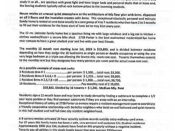 Beautiful 2738 Parker Street...at Piedmont Ave ...Southside campus...Elmwood neighborhood. ...A true 10 Bedroom...12 room ...3 bath house...on 3 floors ...Suggested occupancy...10 to 12 or more ...Nearly 1000 CAL alumni have had their finest years at 2738 Parker ...Location at Parker x Piedmont is the BEST CALM NEIGHBORHOOD close to Campus ...Note: This house has 10 Great Brms, Zillow's only choice for Brms goes up to 8 ...Has been regularly been rented to CAL students who have two years prior renting experience. For many consecutive years this quiet and beautiful 12 room very spacious family home in the calmest close to campus neighborhood just minutes from College avenue or the student fraternal residences on Warring or Piedmont avenue has provided a more intimate and closer feeling of support than other less personal housing. ...The house rent base is $12,500 for up to 10 residents and allows for an additional person at $800 each with not more than 12 residents. Tenants set their own individual room rents and all residents sign a lease as one entity. The preference from this owner is for 12 people, meaning the monthly rent would be $14,100. ...Typically we rent to a core group of 5 to 10 people who are already friends. They will have 2 to 3 months to fill out their full house resident family group. The house ends up having two or three close groups of friends and chooses its required resident manager and other assistants to manage the homes functioning as a close group generally in their last one or two years at CAL. Renting individual rooms with as in a boarding house of strangers does not occur here at 2738 Parker. Signing a lease requires a security deposit of $1,200 per person from the core group. ...The modernized Parker home has the 10 bedrooms on 3 floors, each floor with a full bathroom. Because of the specific floor plan and the house architecture including the separation of bedrooms and bathrooms the house is intimate and quiet and truly feels like a family home. All rooms have oversize windows and excellent natural light. A large kitchen with 3 refrigerators with a close by washer and dryer is always in use. The spacious living room normally has 4 desks allowing students to study outside of their bedrooms. A covered bike rack is available to lock tenant bikes. A motion sensor camera system on the house exterior provides added confidence that residents have come to appreciate. ...We require residents to have two prior years renting experience before being eligible to sign a lease as prior renting experience ensures better house management as well as proper use of facilities and behavior. Residents are required to sign a lease and not have party's of any size as the family character of much of the Elmwood neighborhood wishes to preserve the calm lifestyle and have the typical quiet of such a neighborhood. Lease is for individuals who have minimum of two prior years lease experience and where most tenants are already friends so that harmony will exist. Lease does not allow noisy party's or smoking and requires a organized plan with a house manager to assign duties to keep a clean and quiet family home. Tenants decide individual room rent and room assignments. House often has been used as 5 singles and 5 doubles. Lease is for one academic year starting June 1st, 2021 and ending May 31st 2022. Location of house is near corner of Parker St x Piedmont Ave 1 block from Warring St or the Clark Kerr dorms on the southside of Berkeley. Alternatively walk to campus on College ave and stop at the Strada Coffee shop at Bancroft way...the most ideal off campus neighborhood for a quiet lifestyle.