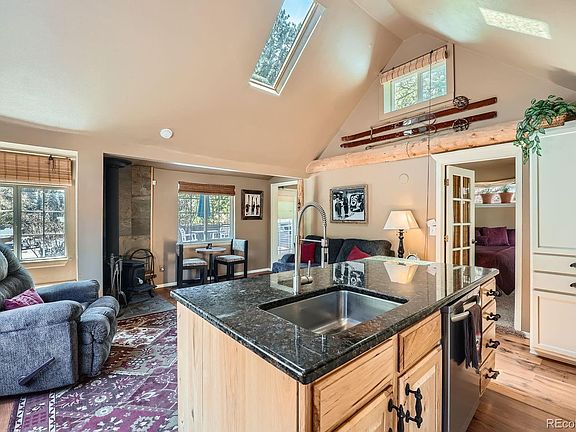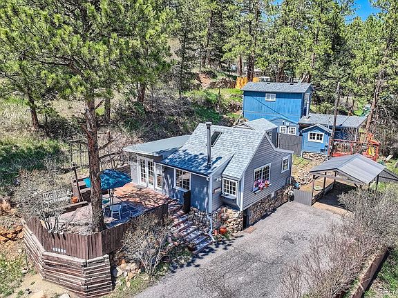 Escape to your cozy Cottage in Evergreen, located within a mile of Downtown Evergreen. Make this bright and sunny, Cottage, your new home. Southern exposure makes the snow melt quickly! Hardwood floors. New exterior paint 4/2025. New class 4 roof shingles 6/2024 with warranty. New furnace 2022. Charming flagstone patio where you can sit and listen for the sound of Bear Creek which is just across HWY 74. Entry/Foyer serves as a mud room. Open concept living area with vaulted ceiling and a wood burning stove. Updated kitchen with stainless appliances and granite countertops. Updated full bathroom with a jetted tub. Stackable washer and dryer included. Detached studio currently used as a guest bedroom.