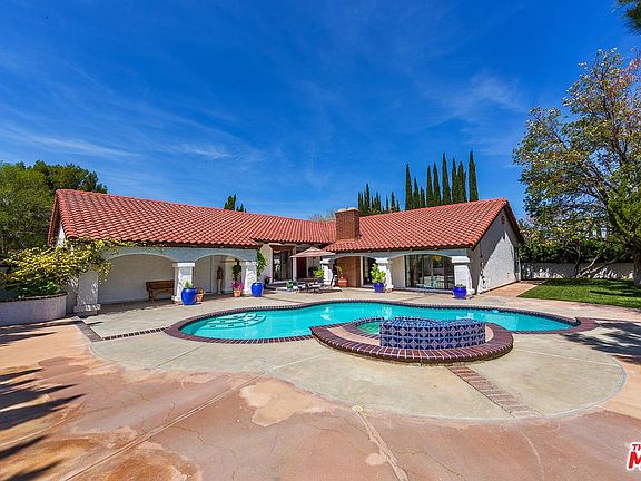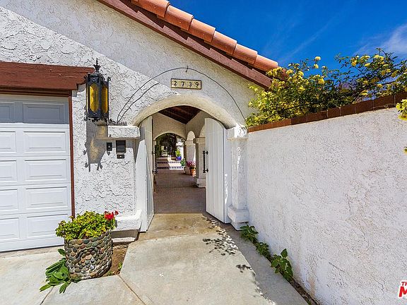 This lovely home is located in Brentwood Estates. The double door gates lead to a private secret garden surrounded by mature trees and beautiful flowering plants. Double doors lead you into the formal foyer. 6 sets of sliding doors enhance the indoor/outdoor feel. This house was made for entertaining, w/an L-shaped counter next to the family room and the breakfast area, two ovens, built-in microwave, and a counter-top stove. Sliding doors and the front door lead to the central courtyard with a large patio facing the pool and spa. High, beamed ceilings and a "fire and ice" fireplace invite you in. The formal dining room has sliding doors leading to its own patio. A grassy area is great for playing, plus there is a dog run around the house. There are three garages, plus extra parking. One bedroom has a beautiful sky ceiling. The master is truly a sanctuary with a walk-in closet, an extra closet, large spa tub, and separate shower with a sliding door out to the pool and courtyard