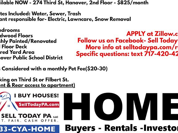 $825/month INCLUDES water/sewer/trash. 2 nice sized bedrooms, 1 bath. Freshly painted/updated. Hardwood floors. Large deck. Private fenced yard (shared with 1st Fl tenant). Pets considered. Apply via Zillow's application. Like us on Facebook- Sell Today PA. Specific questions: text(only) 717**420**4293. Tenant responsible for electric, lawn care, snow removal.
