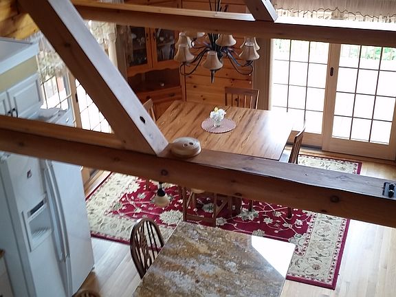 Beautifully private LOG home set on top of a hill on a little over 8 acres. Open concept living with combo kitchen, dining, and living room with stone fireplace, wood beam accents, and rustic tongue and groove ceiling. Features a master suite on first level. Enjoy a cup of coffee on the huge deck facing the easterly sunrise view. Spacious loft with room for extra guests, or additional room for any desired use. Jump off the deck into the above ground pool on the hot summer days, or slip in the hot tub on a cool winter night. No neighbors in sight, your homestead is easy to enjoy! Two car attached garage, 1 car additional detached garage. Bonus HUGE 40 by 70 pole barn garage with 4 bays, 1 big enough for an RV or semi truck storage. This is the home of your dreams!
