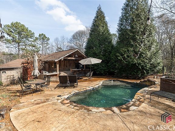 This luxury home sits on 13.58 acres in NORTH OCONEE! It is an absolute DREAM for the outdoor enthusiast or people who love to entertain. You will be greeted by a serene Koi Pond before a path leads you to a fenced-in Gunite Pool accompanied by a Poolside Cabana. Enjoy your morning while sitting on your spacious screened-in porch listening to the rushing shoals. "Little Shoals" Farm is another thing that makes this home truly unique. It has approximately 4-acres fenced with 3 cows, 9 sheep (5 are babies), 8 goats, about 24 chickens, guineas, and more!!