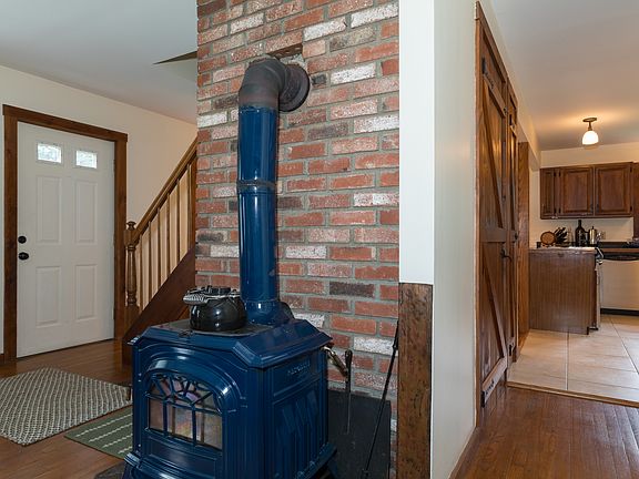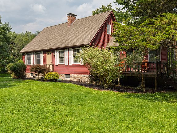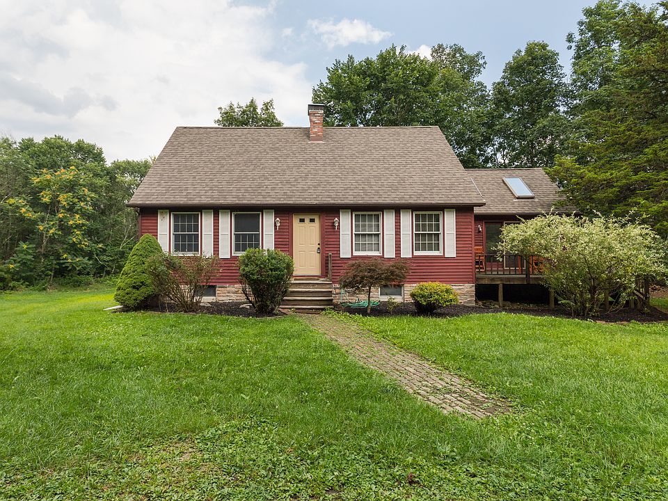 Very private 3 bedroom cape on 3.6 acres. Large detached oversize garage with workshop and a studio area upstairs. House has new roof, underground wiring, beautiful grounds, hardwood floors and a woodstove in living room. Off the kitchen thru French doors is a wonderful sitting room with huge windows & vaulted ceiling that would make a terrific bedroom looking out into the trees, plus sliding glass doors to deck. Eat in kitchen has sliding glass doors to the private screened in porch. The walk out basement has high ceilings, easily finished and two outside entries making for a lot more living space.