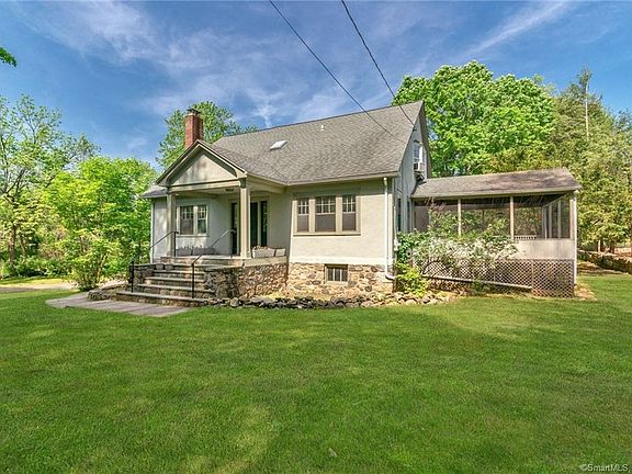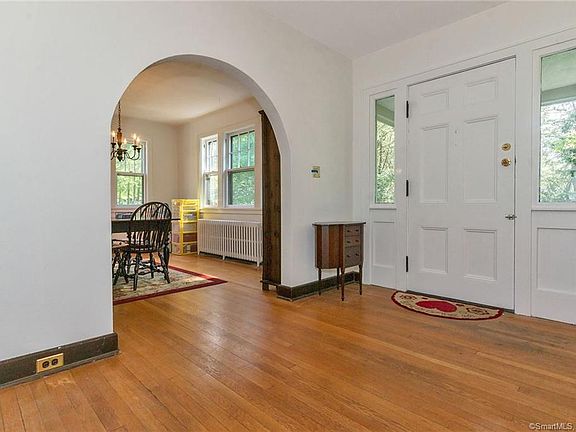 Yes, this house is as cute as it looks! Rare, early 20th Century Cape style home with covered front porch. Spacious, nicely proportioned rooms, separated by charming arched openings and featuring hardwood flooring throughout main level. Eat-in kitchen with gas range and generous counter space. Kitchen opens to family room space for media enjoyment. 2 ML bedrm/office spaces and full bath. Upstairs are 2 spacious bedrooms and two full baths as well as PDS to attic storage. Beautiful 2 acre property with mature plantings and relatively level yard. This is a genuine opportunity to own a charming and unique home just 1 mile from Ridgefield town center. House is sold "as is" .