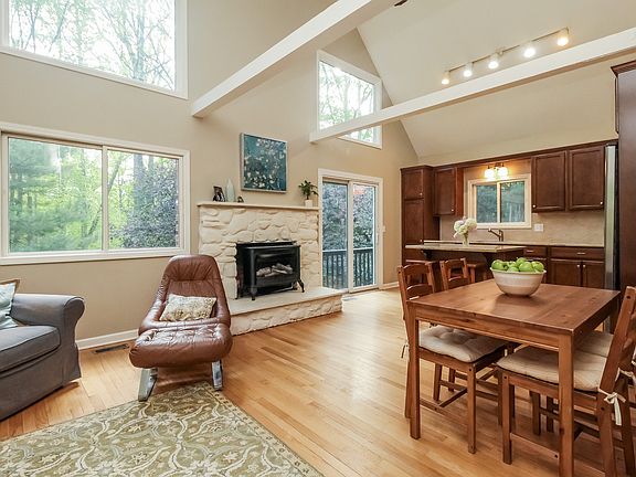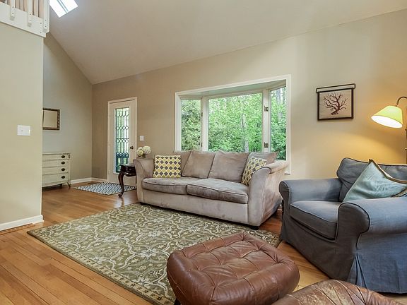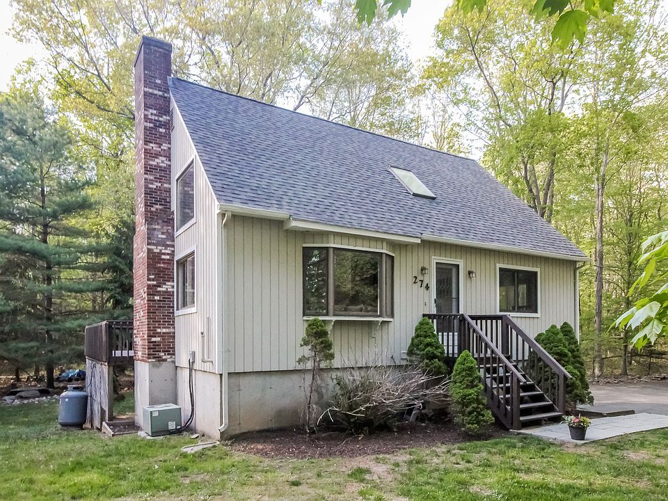 Nestled in a quiet location is where you'll find this beautifully updated Cape with open floor plan, vaulted ceilings, walls of windows, expansive decking and more. The first floor boasts a fireplace and a 2-story wall of windows that bring the outside in, while the open floor-plan allows for ease of entertaining. The kitchen has been updated and features granite counters, stainless steel appliances and center island. A sliding door opens onto the deck that wraps around the house and continues to the second floor. On the opposite side of the house are 2 bedrooms with parquet wood flooring and large closets, and an updated full bath completes the first floor. Ascend the stairs to the second floor and you'll appreciate the view from the balcony-styled landing and the light that filters in from the vaulted first floor ceiling and windows. The spacious master suite features laminate flooring, and a stunning master bathroom that has been renovated with "Pottery Barn" style, including a marble topped vanity with dual sinks. Open the slider to step out on to the upper deck to appreciate the surrounding landscape. The lower level contains a finished family room with slider that leads out to the level yard, laundry, 2 car garage and abundant storage discreetly tucked away in the walls. The home is centrally located for quick access to the historic Guilford Green, shopping and all commuting venues