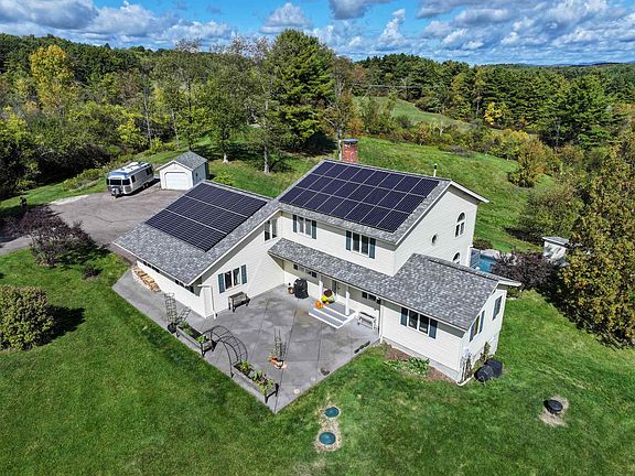What a spot! Situated on 7 acres on a dead-end road, just minutes to downtown Middlebury. Privacy and views abound as you sit on the new stone patio or lounge by the in-ground, salt water pool. Solar was added to this home, and it helps to cover the power including a level 2 EV charger and mini splits that provide both heat and air conditioning. The handsome kitchen features cherry cabinetry, new appliances and granite countertops. The kitchen is open to the living and dining areas, featuring a wood stove for cozy nights. French doors lead out to an expansive deck, overlooking the pool area and the view beyond! An additional room on this level makes a great first-floor bedroom, with an updated 3/4 bath adjacent. This could also serve as a den or office, with built-in storage and wood details. Upstairs, you will find the large primary bedroom, with another deck to overlook your grounds. The renovated full bath has a custom tile shower and soaking tub with heated floors. A smaller bedroom/office and bonus space over the garage allow for options! The lower level is finished off with a guest bedroom, full bath and living space. This level walks out to the pool- it will be everyone's favorite! Space for storage, mechanicals, and laundry just around the corner. You will have room for all of your vehicles and lawn mower with the attached, two-car garage plus a bonus detached, one-car garage. Plenty of yard to run around, garden, or have animals! Showings start 10/2.