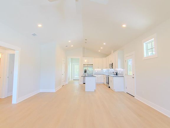 This NEW 3 bedroom/ 2 bathroom home is a property you are not going to want to miss! Located behind natural vegetation, this home is both private and peaceful with a covered back porch perfect for lounging and entertaining! With an integrated kitchen and living area, this home boasts a bright and airy floor plan that spans 1401 sq ft of carefully designed living space. Built by one of Eastpoint's premier builders, this charming home includes a shingle roof and Hardiplank siding, ensuring both durability and peace of mind. In the kitchen, you will find all stainless-steel appliances, an all-quartz island and countertops with soft-close cabinets. The flooring consists of LVP in the kitchen/living area and gorgeous tile in both bathrooms. More specifically, the master bathroom includes a tiled shower, a double vanity, and a walk-in closet! Floor Plan is included in the documents.