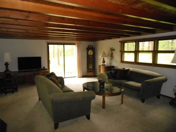 Custom cedar shake shingle ranch with new roof on a wooded 6.57 acres with a 60x45 Morton outbuilding with 13 ft doors. Open concept with a wood beamed and paneled ceiling, new stone faced gas fireplace by the fireworks, many updates, fixtures, new flooring in spacious bath and tile backsplash in kitchen, newer appliances, fresh paint, 200 amp service. A heated woodworking shop attached to garage. Stone patio and hot tub. 1st floor laundry/mud room.