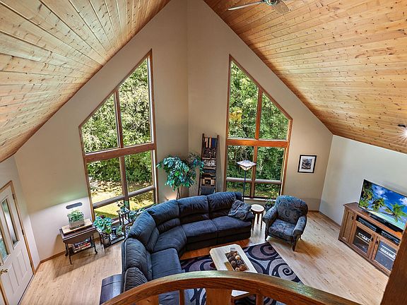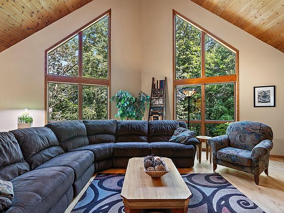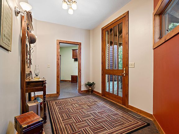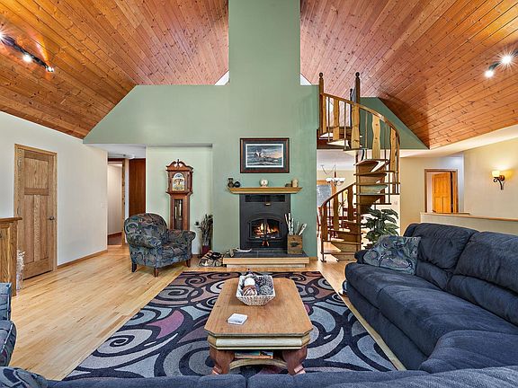 Quiet haven within 25 minutes of St Paul, perched up on a hill for elevated privacy and prominence. Mature trees, on a peaceful wooded lot. Cathedral like living room with soaring windows - making space for bright creativity and connection. Cherry kitchen cabinets with coffee and wine bar will invite lots of warm memorable gatherings. Three bedrooms and convenient laundry on the main floor. Full kitchen in-law unit with a separate entrance for rental income, family or guests. The generous lower level will be the desirable hub for game days and movie nights. Hot tub location with wiring already in place. Unfinished garage bonus space is an exciting spot for a future home office, yoga, art, or recording studio. Abundance of space and opportunity! This home is the setting, you bring the people, together it's story to be written!