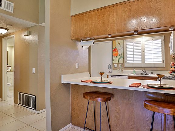 This two story town home is an end unit with extra windows and extra light. These great units are affordable for two bedroom homes, and offer a cute private courtyard with endless outdoor entertaining possibilities. Past the private back patio courtyard is a two car garage. There is also an additional private balcony of the master suite upstairs with nice views of the greenbelt. This complex is centrally located in a great area with convenient access to businesses and shopping. This complex boasts abundant green space, mature shade trees, and community pools, spas, and BBQ areas. Affordable homes with lots of nice features. Come make this your oasis under palm trees!