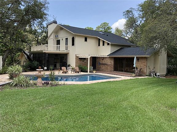 This pinellas county estate home is situated on two acres of treed land and is truly a must see. It was custom built and is being offered for sale by the original builder-owner. From the welcoming central foyer you can choose to enter double French doors into the formal living room featuring a wood-burning fireplace, cathedral ceiling, built-in bookcases and an expanse of glass with views of the large pool, outside decks and the pergola. The central foyer also leads tFwhito the formal dining room, kitchen and family room. The formal dining room is large with plant window and crown molds. The kitchen is truly unique with beamed open views of the second story upstairs living area, new maple self-closing cabinets, granite countertops, newer stainless appliances, center kitchen island with bar seating as well as room for large in-kitchen dining table so as to accommodate big gatherings. The family room has additional table-height bar seating, a bay window, the home's second wood-burning fireplace, as well as cabinet/bookcase built-ins. There are French doors leading to the brick-floored screen porch with an electric fireplace.. The screen porch leads onto the paver covered outdoor space to the open air pool or to a large 18x50 side deck that can be accessed from either the kitchen or family room for entertaining. Upstairs you will find 3 of the 4 home's bedrooms with beamed cathedral ceilings. Enter the master through double French doors. The master bedroom boasts 3 closets, wet bar, and access to the owner's private upstairs balcony. The master bath is spacious with tub, shower, and closet also with balcony access. All baths have granite countertops and wood cabinetry. Features include plaster walls, solid wood interior panel doors, custom wood ceiling treatments with stained trims, wired stereo, economical water-to-air A/C systems, skylight, conversational telephone booth, wall mounted TVs, and much more. Outside you will see there is a new 2019 roof with transferable warranty, fresh exterior paint, fully fenced rear yard, lush landscaping, sprinkler system and landscape lighting. The home is situated on 2 acres that is heavily treed with room for a tennis court or to accommodate horses per pinellas County zoning. The pool has been recently resurfaced with a pebble finish, newer variable speed pool pump and there is a large paver patio. Additionally, there is a garden shed with electric and water. The home has both attached and detached oversized garages to accommodate larger-sized vehicles and each garage with new garage doors. one of the garage bays has served as air conditioned workshop. You enter the property greeted by an attractive brick entrance from a neighborhood of all 2 acre estates. There is a recently repaved and resealed circular drive for easy entry and exit with multiple parking pads for guests. If you are looking for a home that is not cookie-cutter but has all the modern features, this may be the one for you. Its custom features, uniqueness and functionality of footprint make this home truly special!