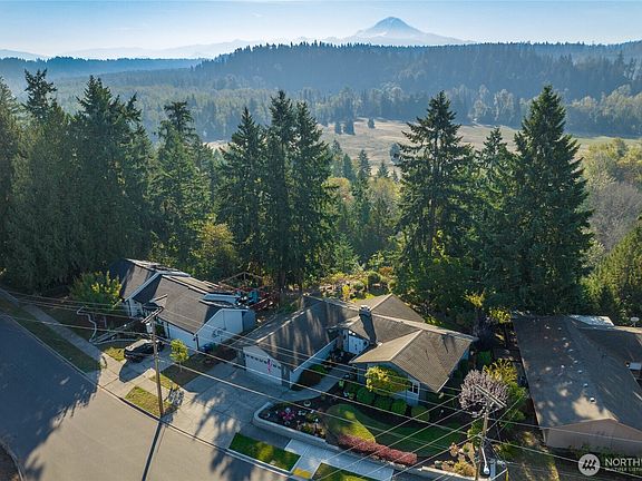 Perched atop Forest Ridge with beautiful Mt. Rainier views, this elegant rambler with finished daylight basement blends timeless style with modern comfort. Floor-to-ceiling windows, exposed beams & stone fireplace create a warm, sophisticated living space. The large kitchen features a 6-burner Viking range & generous storage while the dining room opens to an expansive deck perfect for entertaining or quiet mornings overlooking the valley. The main-level primary suite offers a serene retreat with a beautifully updated bath. Downstairs, a full 2nd kitchen & 2 spacious living areas provide versatility for guests or potential ADU. Impeccably landscaped grounds, central A/C, tankless water heater & new carpets complete this exceptional home.