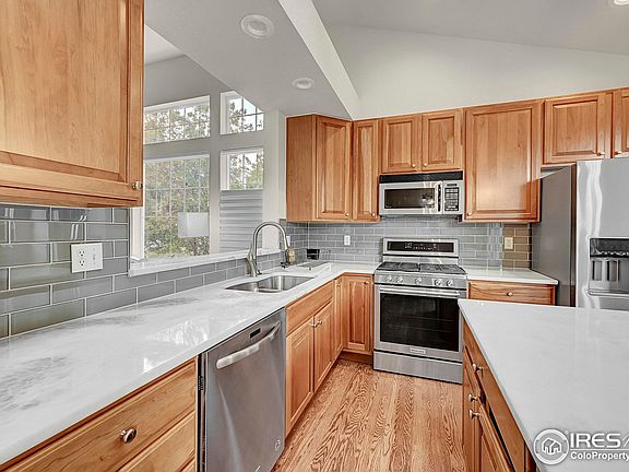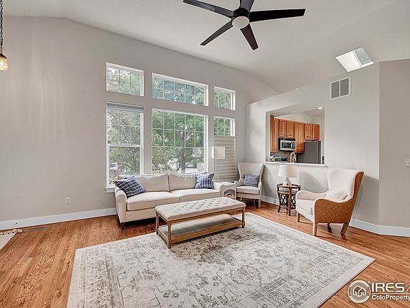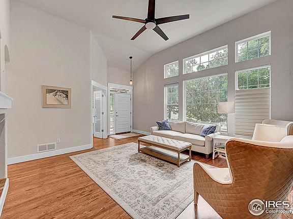 Beautiful ranch style home with professionally finished daylight basement in awesome location with small park across the street and Indian Peaks golf course just to the west. Wonderful upgrades and updates. Design offers high ceilings, large windows and lots of light. Main floor feels bigger than the 1347sq.ft listed. Real oak hardwood floors on entire main floor(dark stain). Kitchen has 4 burner gas range, marble counter tops and cherry stain cabinetry. Living room has large windows, quality window coverings, vaulted ceilings, entertainment niche large enough to hold 65 inch tv and gas fireplace. Deck Access of dining room. Main floor study with french doors. Primary bedroom has vaulted ceilings, ceiling fan, 2 walk in closet and beautifully updated 3/4 bath with double vessel sinks, tile floor seamless glass shower door. The daylight basement has a large family room with lots of room to spread out, perfect for entertaining. 2 more nice size bedrooms and and nicely updated 3/4 bath. The yard is thoughtfully landscaped for privacy and low maintenance. There is no grass to cut. The yard offers an artful use of rock, flagstone walk way, shrubs, bushes and trees. Trex style Deck off dining room leads to flagstone patio with free standing wood firepit in back yard. Easy to show. Refrigerator, washer, and dryer are included in sale. Hoa does not pay for any yard maintenance. It covers only for common area maintenance and trash.