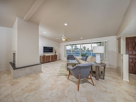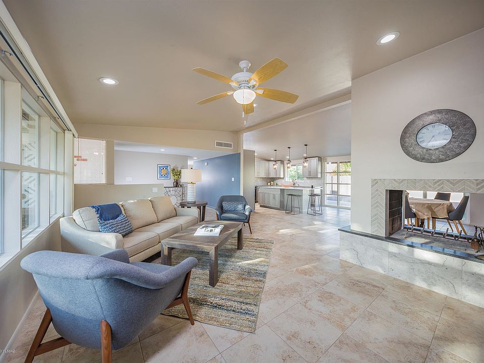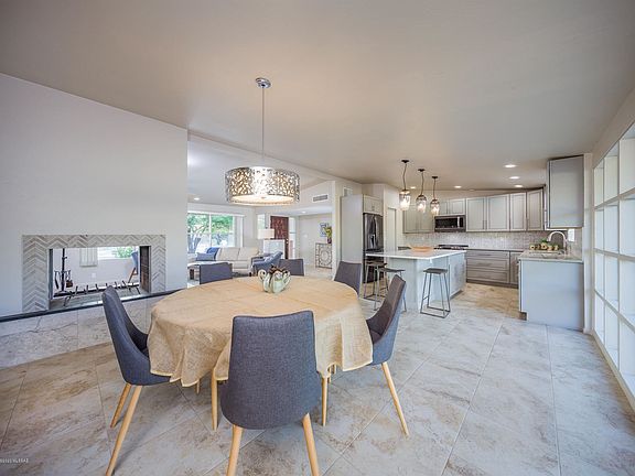 Beautifully remodeled open concept contemporary mid-century home in central Tucson. Walking distance to Ft Lowell Park, the Loop bike route and TMC. Quartz counters in kitchen and baths, new SS appliances, two tone maple cabinets with polished nickel hardware and self close drawers and doors. Spacious bedrooms (3 with over-sized closets). Plenty of storage in outside double carport. Easy care front and back yard. Landscape and beautification project in progress by city for Carlos Terrace. Huge windows from front to back of house lets in plenty of light. Double facing fireplace with marble and quartz tiles between dining room and great room. Neutral paint colors, LED lighting. Newer water heater and A/C. Separate laundry room. Staged furniture and accessories also for sale.