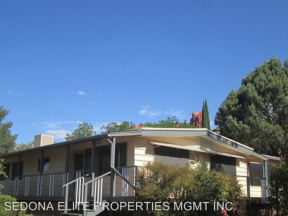 - 3BR/2BA recently remodeled manufacture home on corner lot located in the highly popular area of West Sedona. Approx. 1,600 sq., great room concept and split bedroom plan. Very spacious front porch, approx. 46 ft. on your way to the front door and wraps around the side another 24 ft. Step inside to a great room with wood burning stove, hanging light and large windows. Through the barn door is an ample bedroom with raised ceiling, closet and many windows streaming in natural light. Kitchen features electric stove oven, refrigerator, dishwasher, new garbage disposal, window above the kitchen sink and cozy breakfast bar for two. Adjacent is plenty of space for a dining room with a large picture window. Second bedroom offers new carpet and shares a full bathroom with tub/shower combination. Master bedroom showcases two large picture windows, built ins and the master bathroom offers extra storage space with tub/shower combination. Laundry room with washer/dryer on your way to the fenced backyard. Two wonderful outside shop/storage rooms next to the carport and Owner will maintain use of one. Carport for two vehicles. $1,695/mo. Owner reserves the right to occasionally use the parking area off Windsong next to the steel shed for RV parking when he visits the area (RLNE4191002)
