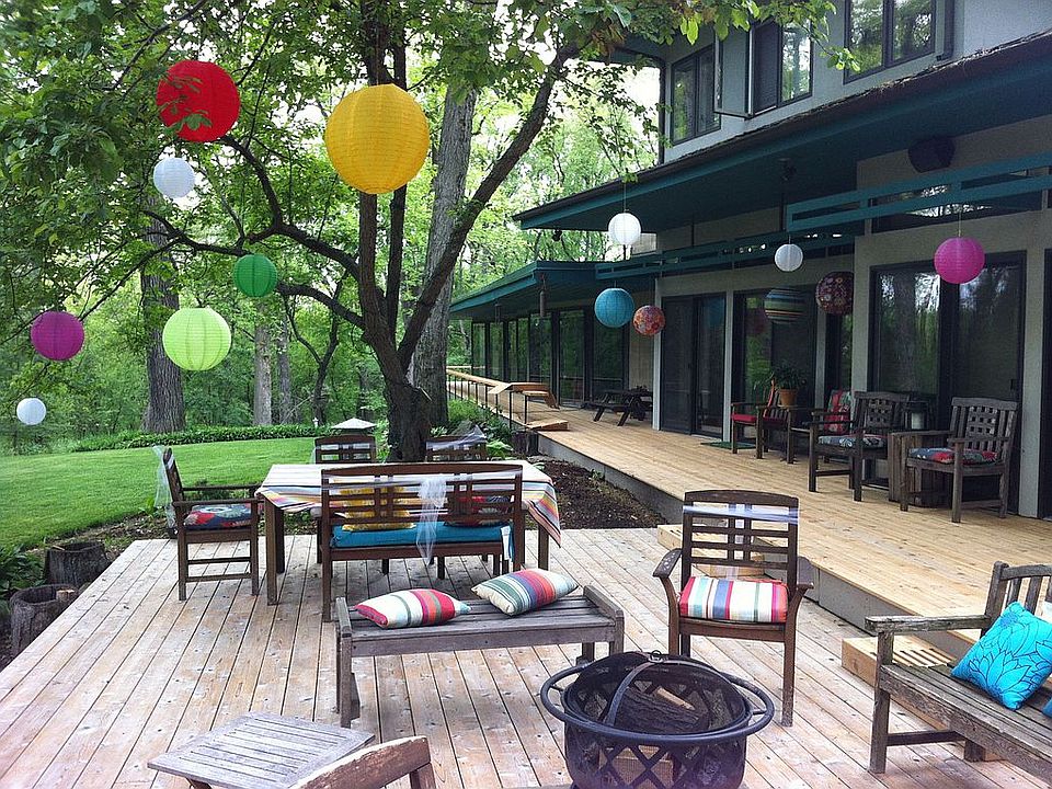 Frank Lloyd Wright student Usonian home, updated in 1992 with 2 bedrooms and a bath upstairs. 3 Fireplaces. Walkout basement, heated 1 car garage on lower level, 2 car garage on main level, wrap around deck, front patio, cork floors. Master suite on 1st floor with dressing area, walk in closet, separate shower/whirlpool tub/toilet room. Updated kitchen with cherry cabinets, cork floor. Neighborhood Description wooded, 5 acre (approx) lots, horses, yet only about 2 miles each to Lake Zurich, Barrington, and Fox River Grove shopping.