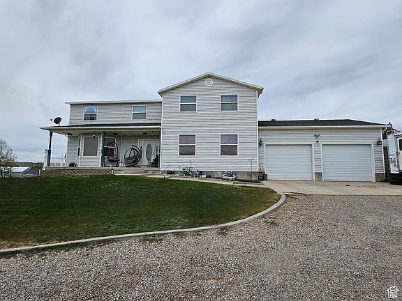 Located on North Vernal Bench along North 2500 West, this two-story, 5,217 sq ft home with a finished walk-out basement offers six bedrooms and 3.5 bathrooms. The main level features a family room with wood-burning stove and a kitchen with double oven. The primary suite includes a soaker tub. Four bedrooms are upstairs, one on the main level, and one in the basement. The home sits on 2.20 acres (three parcels: 1.10 acres with the home, shop, outbuildings; 1.12 acres with 1 acre foot irrigation water, 10 ELUs stock water - Well Water Right 45-5944). Garage parking enough for 10 vehicles: 30x55 (1650 sqft.) 4-bay shop (10' height by 12' doors), Oversize 2-car (26x27) attached garage), plus RV and outdoor parking for 25+ vehicles. Features include mature pine and fruit tree's, a fully fenced backyard, automatic sprinklers, and an aluminum walk-out deck form the main level. Connected to central air and heat, city culinary water, city sewer, Rocky Mountain Power electric, and Embridge gas, gas dryer hookup. No HOA; zoned for horses. Located in the Uintah School District (Maeser Elementary, Vernal Middle, Uintah High). Contact listing agent for details or to schedule a showing. Pool table in basement is included.