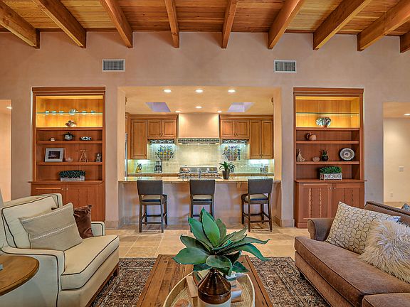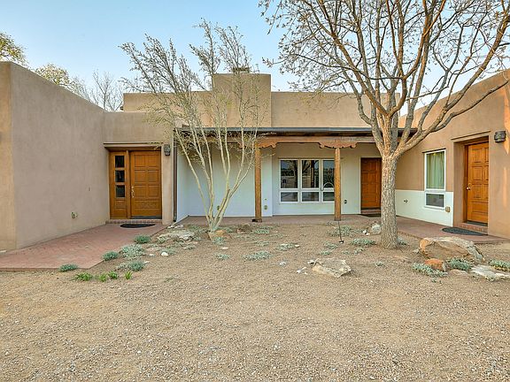 This architecturally designed, adobe home offers gracious living in a prime, privately gated North Valley location near the Rio Grande Nature Center, which offers miles of trails & easy access to the bosque. This property boasts the highest quality construction & amenities for a comfortable yet luxurious lifestyle. It features spacious rooms, limestone, tile & parquet floors, stunning beamed ceilings, doors & custom furniture-quality built-ins. Other amenities include high-end appliances, butler's elevator & wine storage adding sophistication & convenience to the living experience. The exterior of the property showcases a stunning fountain, beautiful patios, lovely landscaping and fruit trees. This home truly provides the perfect blend of elegance & comfort for the discerning homeowner