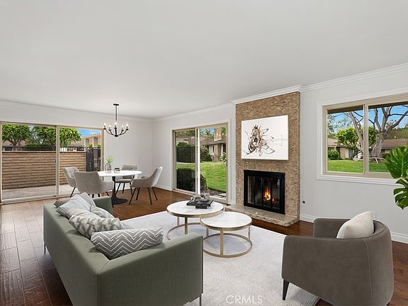 Don’t miss this incredible opportunity to live in this highly desired single level, 2 bedroom, 2 bath home located in the serene, parklike setting of this 55+ community of San Juan Hills East. This home is directly across from the San Juan Hills Golf Course, driving range and restaurant, where you can enjoy drinks and dinner at sunset and enjoy live music on the weekends. Enter the home through elegant double doors and be greeted by a centrally located artistic fireplace in the light-filled great room. The bright kitchen includes updated cabinets, abundant storage and showcases barstool seating at the counter that adjoins to the dining room, which in turn flows seamlessly into the living room. Sliding glass doors allow access to the large