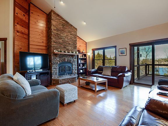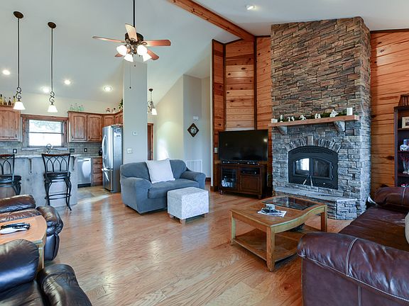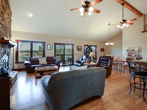 TABLEROCK LAKEFRONT with a SLIP AVAILABLE (extra $) that's just a golf cart ride away! Beautiful log sided custom built home complete with a view from the covered deck, livings rooms (both) and from every bedroom. 3 bed 2 and half bath home. Attention to detail with the cozy wood burning fireplace in the living room, vaulted ceilings, hickory cabinets with granite counters, wood accent walls, zoned heating and extra deep 26x26 garage with work bench and shelving. Everything you need is on the main level with the open kitchen, living room, laundry off the garage, master suite and additional half bath. In the finished walk out basement there are 2 bedrooms, additional living, full bathroom and covered patio. A convenient 10x15 ''John Deere'' garage is located in the back of the home as well.