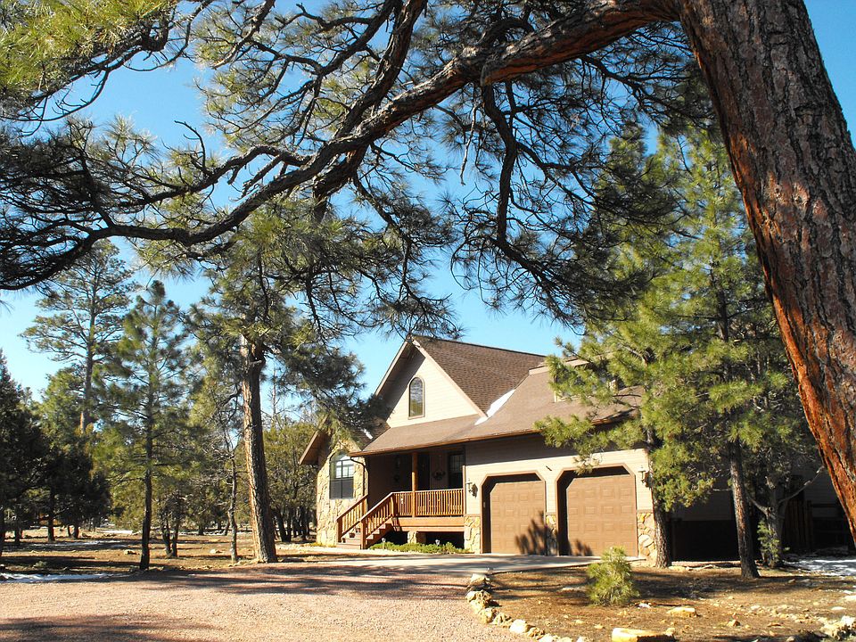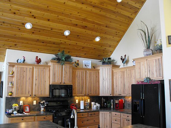 Beautiful mountain home with all the right upgrades, of top of the line 2x6 construction, on .86 of an Acre. This home looks like 2 stories, but actually is all on one level with high vaulted ceilings with cedar T&G in Greatroom for a very spacious feel. Stone Heatilator fireplace w 3-speed fan. Oak flooring in Kitchen and Dining with diagonal ceramic tile in entry and bath. Custom Knotty Hickory cabinets and matching built-in china cabinet. Trex decking front and back. Surround sound in greatroom, master, master bath, garage and rear deck. 19 Seer high efficiency Trane electric heat pump for heat and AC. 2 car oversized Garage fits a big Pickup and another vehicle and forest toys. Storage under stairs, workbench & shelving. Backyard fully fenced with peeled log fencing, great for dogs!