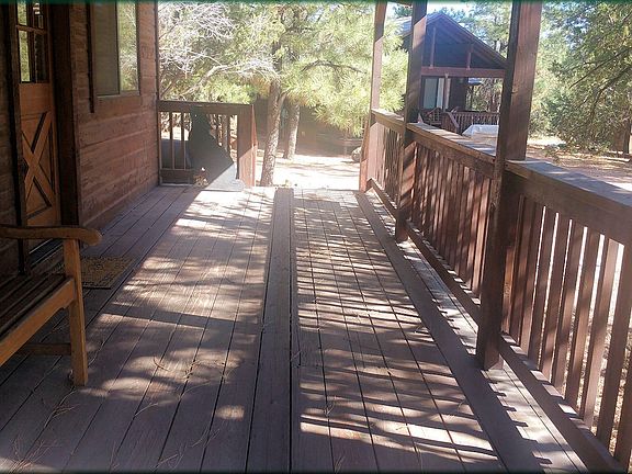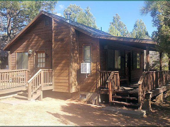 Clean cabin with aspen tongue in groove vaulted ceilings, laminate flooring and cozy living dining area accentuated with a gas fireplace. Nice location across from the Bison Ranch and near the Mogollon Airpark. Full length covered deck and separate master bedroom entrance with its' own open deck. Storage shed as well for your toys when you're not using them. Come see this cabin today! Seller is a licensed Realtor.