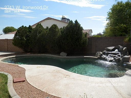SCHEDULE A SHOWING ONLINE AT: showmojo.com/lh/869f71b014 5 bedrooms, 3 full baths, (2 bedrooms downstairs). Huge kitchen w/granite counter tops and lots of cabinets. Breakfast nook and formal dining room, travertine floors, fireplace in family room. Close to shopping and access to Loop 101. Backyard features a pebbletech pool with water feature, extended covered patio and mature trees offer lots of shade. Security Deposit $1895 Cleaning Fee: $250 Pet Fee: $250.00 (if applicable, we do not allow pit bulls, rottweilers, Dobermans, or chows) Click APPLY NOW! - $35 app fee (per adult 18 and older) can be paid here also. Upon approved application a $500 earnest deposit & $195 admin fee are due within 48 hrs. Any remaining deposits and rents are due at the time of lease signing. Tax is not included in rental rate and is non-negotiable (taxes vary by city).