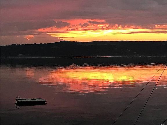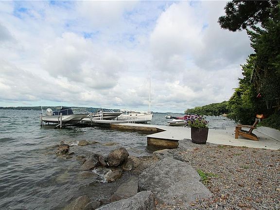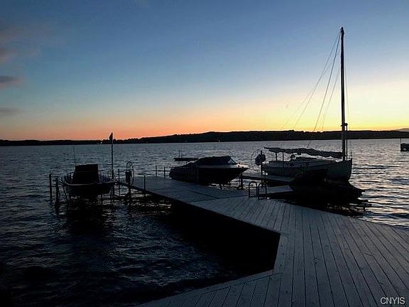 "180 degree views" at the widest part of Skaneateles Lake, approx. 210ft of water frt. The property, more than ½ mile off E. Lake Rd, is located on a deadend which ensures serenity. An acre of dense evergreens were planted in the 1960s by the previous owners to mimic their beloved Adirondacks, while maximizing the privacy on the land which juts out into the lake. The 4bdrm, 2ba,2500sq.ft camp was designed for casual living in mid-century modern style by architect Alain Verney and sited to take full advantage of the breathtaking sunsets. The deck, level with the first floor, is an unbeatable outdoor living room at the water's edge, and the developed waterfront, with a permanent pier, is only a few steps away. The property includes a shoreline "sleeping shed" and an attached two car garage.
