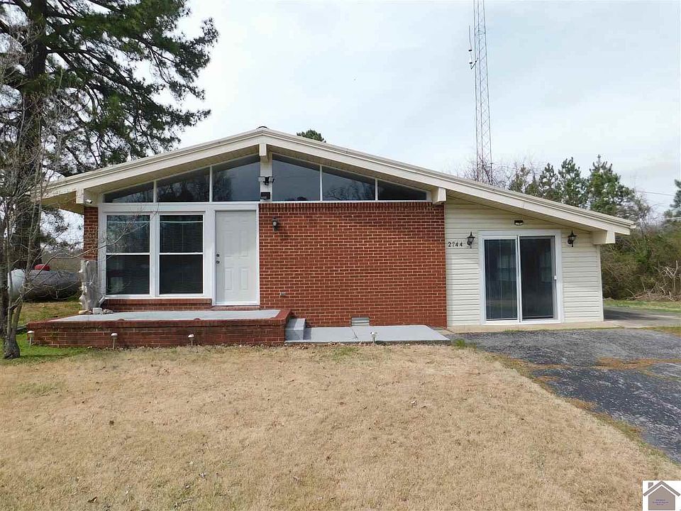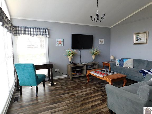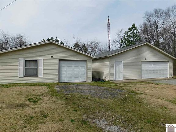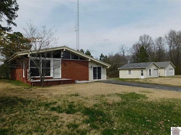 Charming Mid-Century Modern home just a short drive from Kentucky Lake with refreshing in-ground pool. Main living area has vaulted ceilings, large sunny windows and cheery and updated kitchen with plenty of storage. Attractive solid surface flooring throughout. Additional family room plus office or study allow for flexible living space. Two large detached garages offer plenty of workshop area and space to store pool equipment and larger garage is 32'x32' for boats or toys. Home served as vacation rental and would be great for year round living or lake area vacation home.
