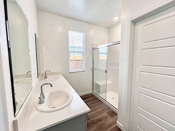 Main bedroom has walk in closet. En suite bathroom with dual vanities and walk-in shower. Two additional bedrooms. Hall bath with single vanity and tub/shower. Interior laundry with washer/dryer. Attached 2 car garage.