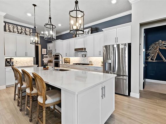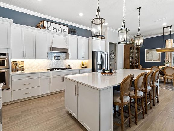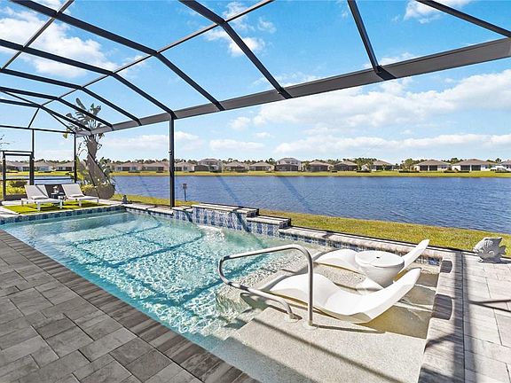 Stunning waterfront Renown Model home on oversized lot with many luxury upgrades. Welcome to resort style living in this highly sought after Del Webb Sunbridge 55+ community. This home comes witg owned solar panels and transferable 30 year warranty...giving current owners a $0 electric bill! Views from this home include a pool, pond, lanai wildlife and beautiful sunsets. Lanai features a built in outdoor kitchen, motorized screen and pool 1/2 bath. Home features a grand entrance, high ceilings, 8 ft doors, custom plantation shutter, and custom closets in the bedrooms. This is an open concept home with a big kitchen open to large dining room, great room with stack sliders, 3 bedrooms, 3 baths and 2 half baths. Large Master bedroom features 2 walk in custom closets, super shower and access to the laundry room. Other features of the home are 3 car garage with epoxy flooring, custom lighting, and walk in pantry. Del Webb Sunbridge is a 55+ community with many amenities including a 27,000 sq ft clubhouse, 2 pools, tennis, pickleball, wet/dry craft froom and a lifestyle director. Many planned events are on the monthly calendar, This is one of the nicest homes in the community with a premium lot. Don't miss your chance to live in Del Webb Sunbridge.WELCOME HOME! Home is agent owned. Furniture available for seperate purchase.